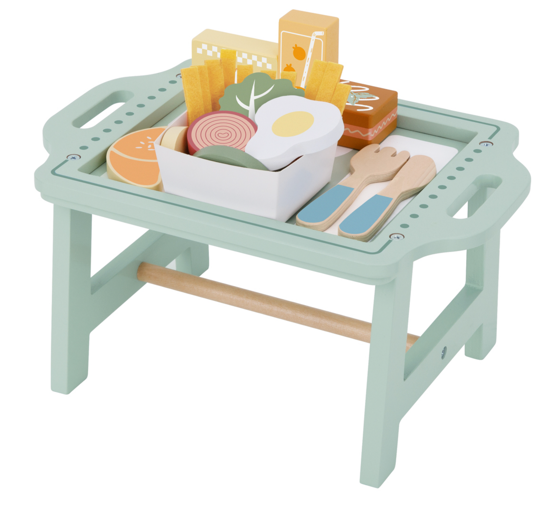 This delightful 26-piece set includes a wooden tray with stands, wooden food items, felt accessories, and child-safe utensils for hours of pretend play. Children can serve up a realistic breakfast featuring an egg, onion, tomato, mushroom, croissant, orange juice, butter, and more — all lovingly designed to look just like the real thing.