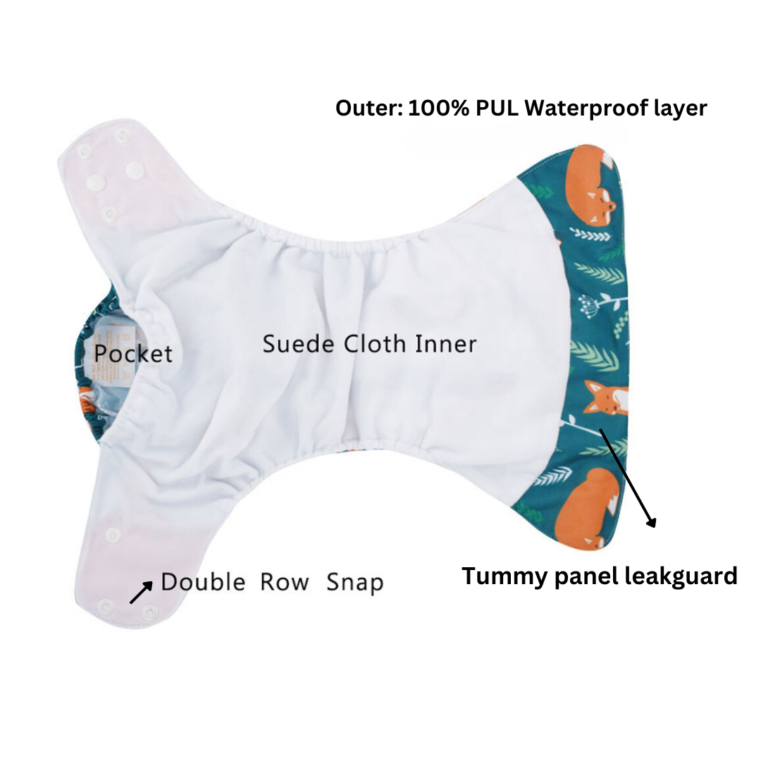 Enhanced Absorbency: Each nappy includes a three-layer microfiber insert, conveniently nestled within the pocket for superior absorbency.