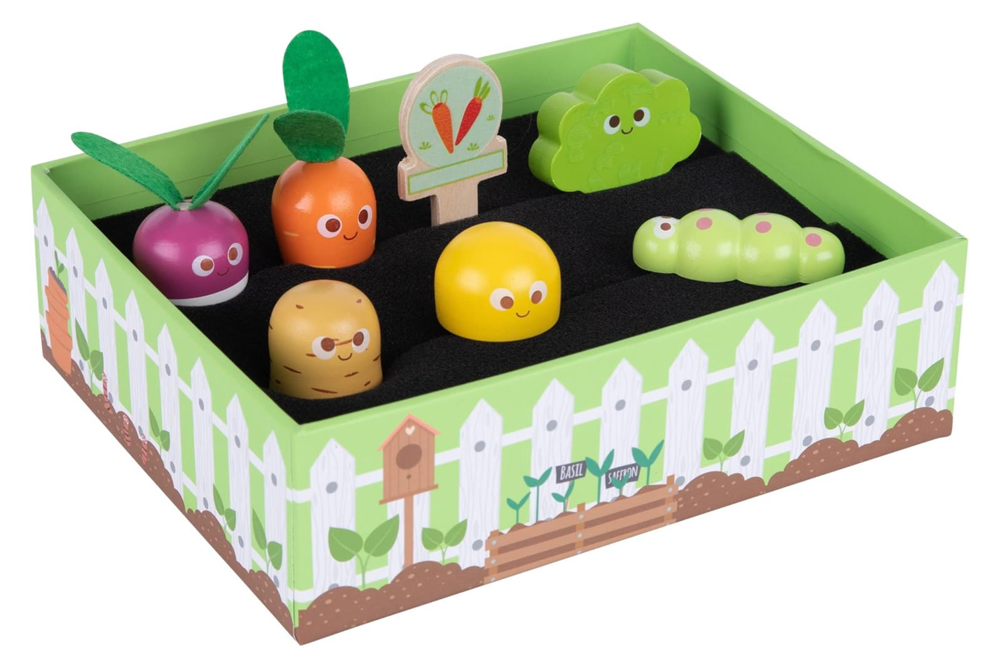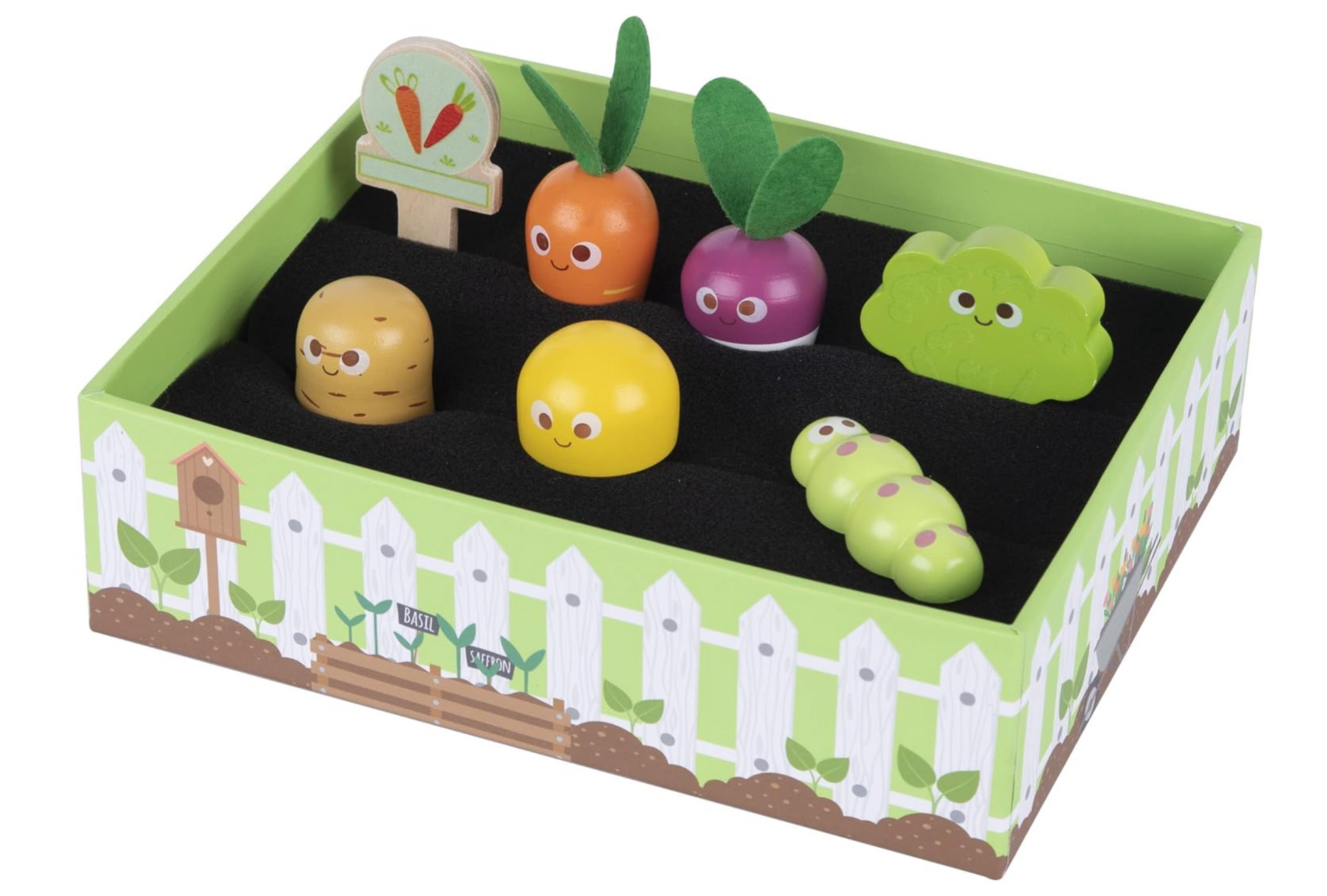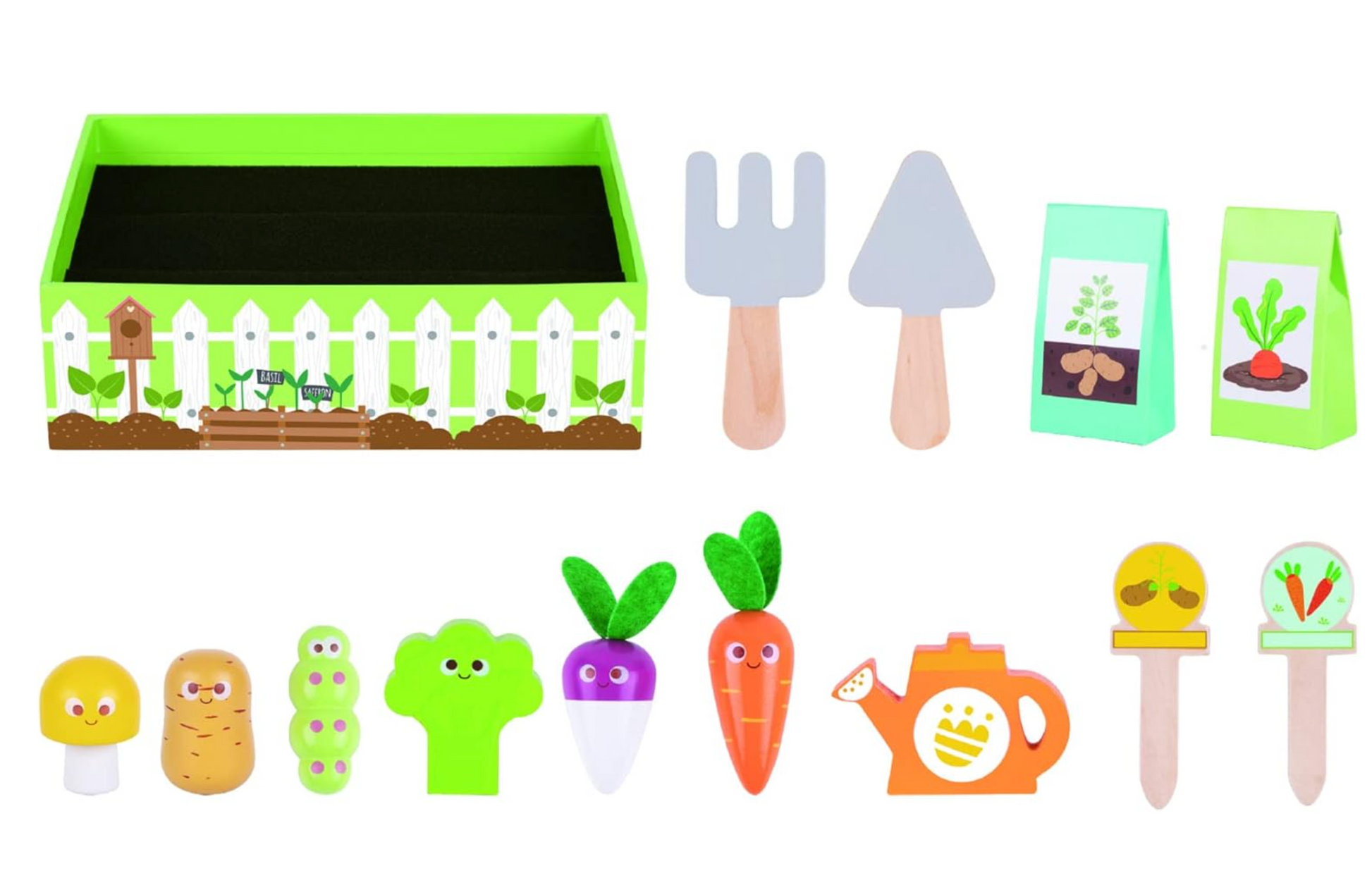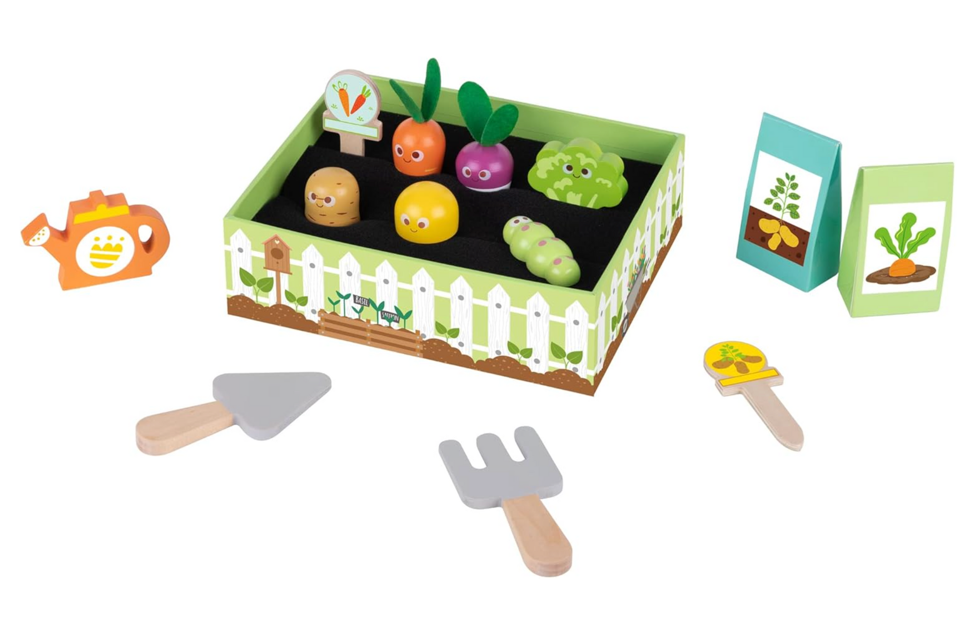 Featuring 5 adorable wooden veggies — carrot, potato, mushroom, broccoli, and turnip — plus a cute caterpillar, watering can, 2 garden tools, 2 seed packets, 2 vegetable labels, and 2 rows of planting soil, all neatly contained in a sturdy wooden garden tray, this set provides endless opportunities for imaginative role play.