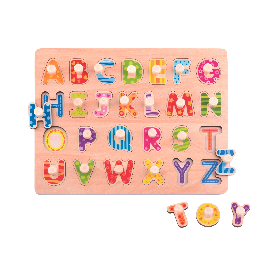 This Wooden Alphabet Peg Puzzle from Tooky Toys is a great educational tool for small children. Featuring 26 pieces in upper case, this handcrafted puzzle allows kids to practice picking up and grasping pieces, while fostering hand-eye coordination as they place the pieces in the correct spot. Crafted from timber and painted with non-toxic paint, this colorful puzzle encourages the development of the pincher grasp as well as letter recognition.